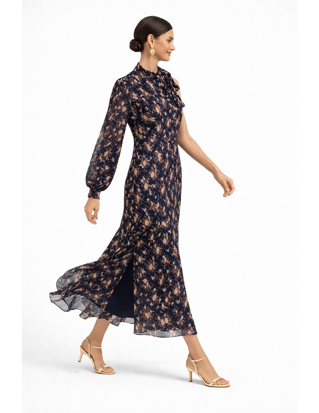 Vestido de gasa estampado con una sola manga y lazada en el cuello.